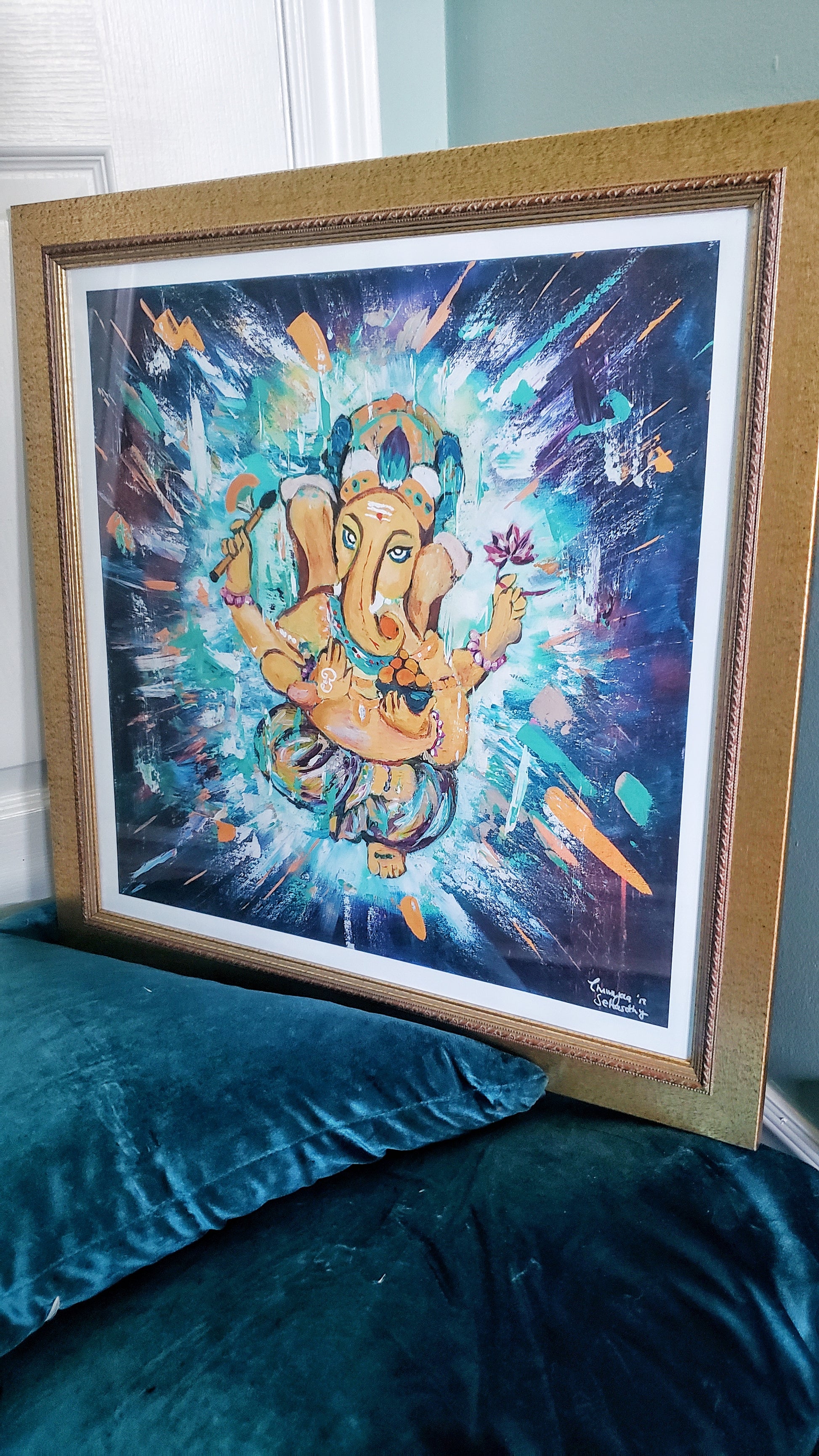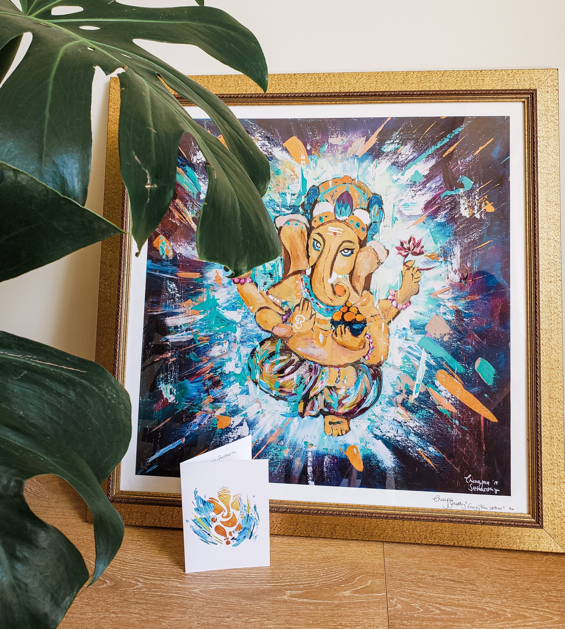 This is a beautiful option for a print for any study space, living room, prayer room and it pairs perfectly as a gift to any family or friend for a new beginning or chapter in their lives, or who has a connection to Ganesha. A very meaningful painting, and I hope you enjoy this. Made with love.