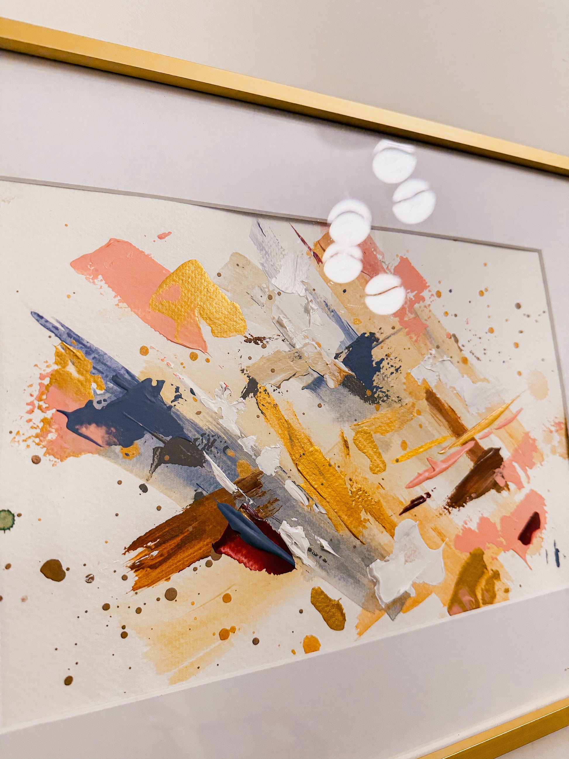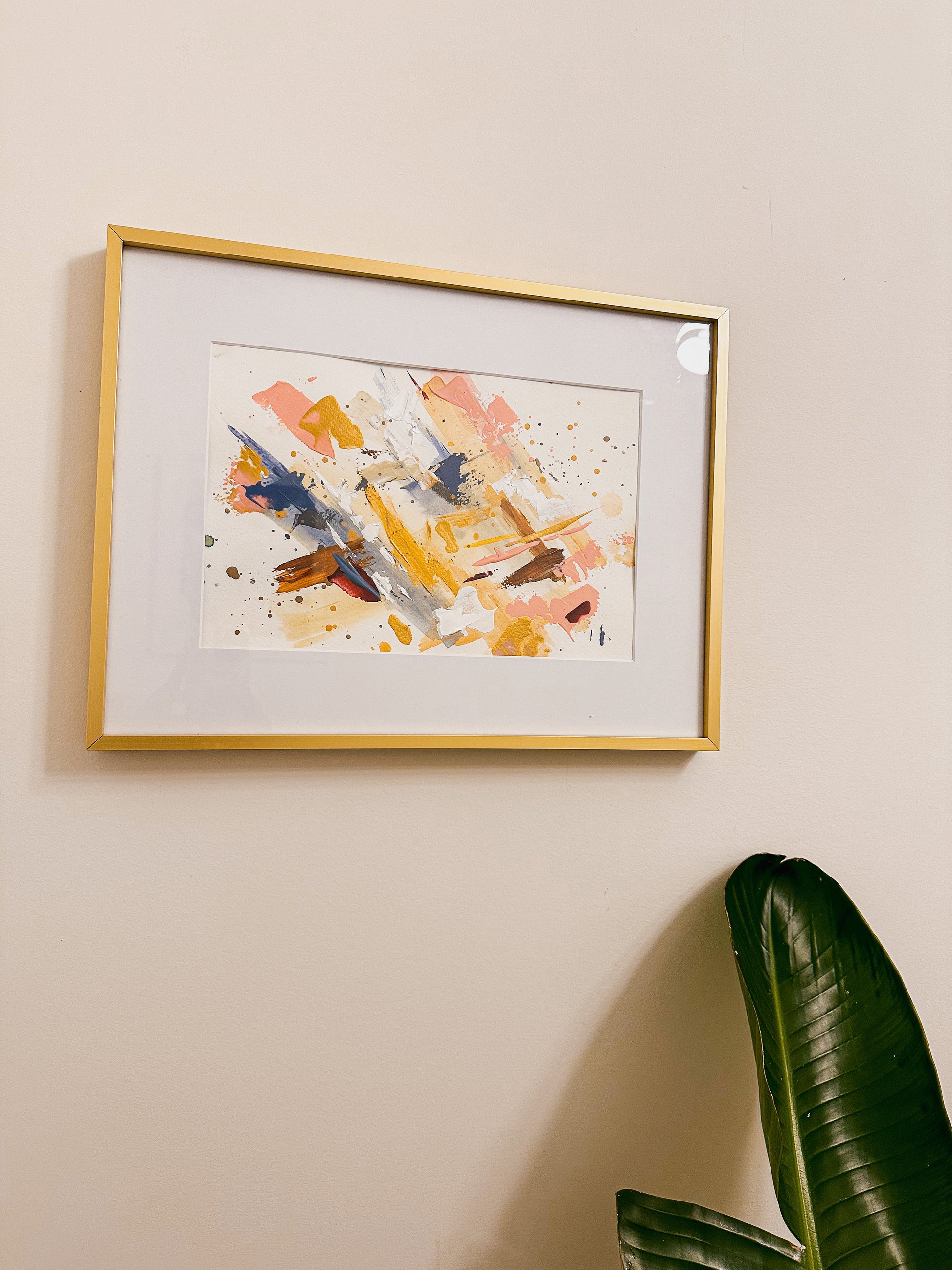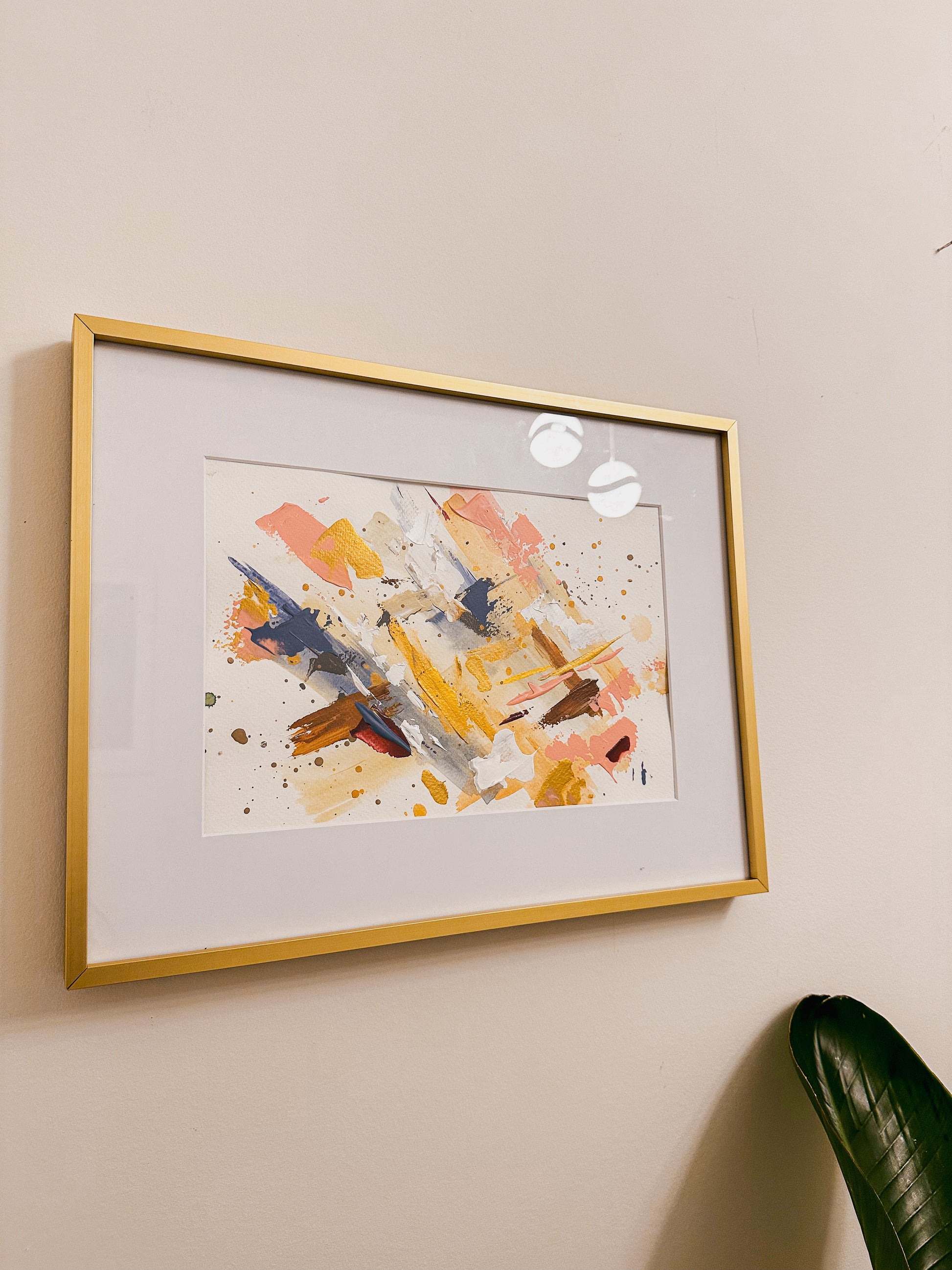 These paintings belong in a beautiful brushed gold frame. I highly recommend adding the gold frames with the art piece. The gold matches perfectly with the gold accents in the paintings. If you are interested in framing ($45), please add a note in your order or email me and I can invoice the additional framing cost. Please note, framing is only applicable for pick-up orders.