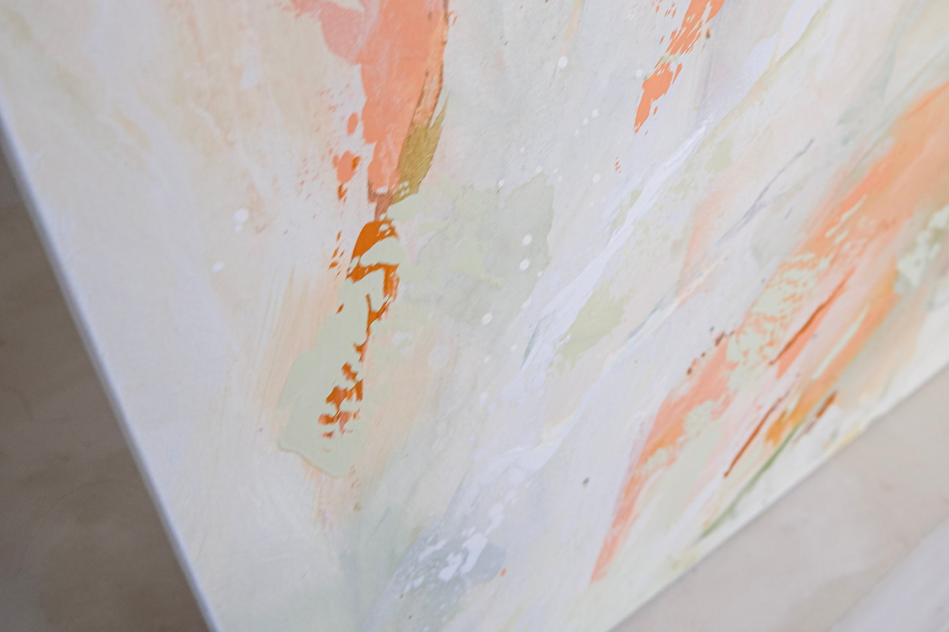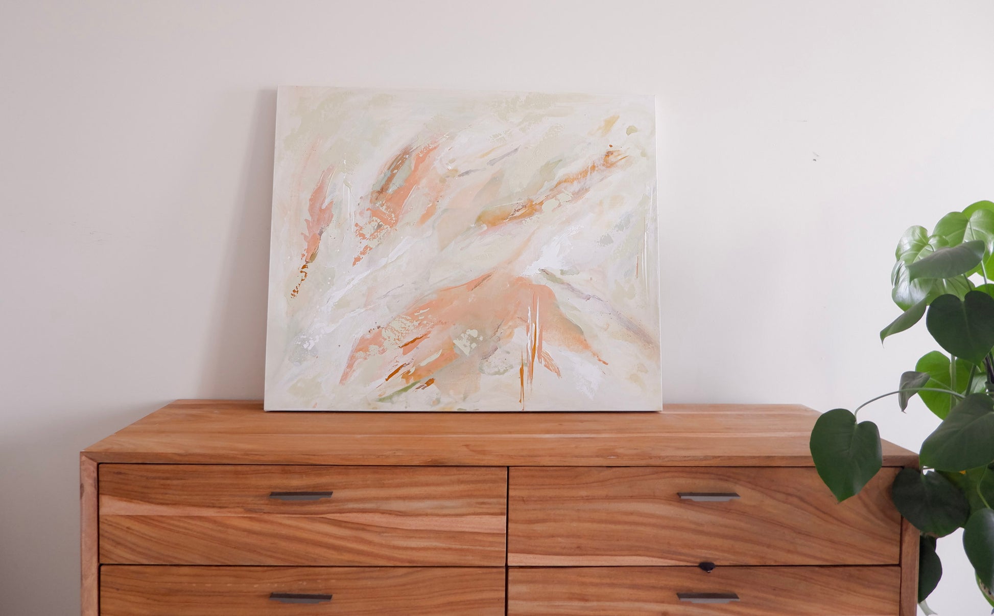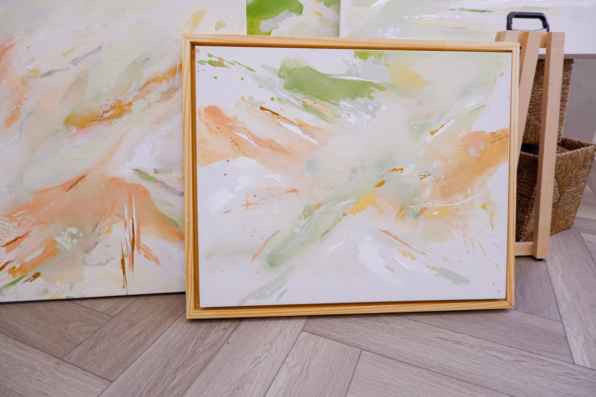 This piece invites introspection and serenity. Shades of sage green, dusty warm and peach tones balanced on a neutral palette creates movement that encourages quiet contemplation within the viewer's own reflections. The space will feel vibrant with the accent tones yet neutral and fresh.