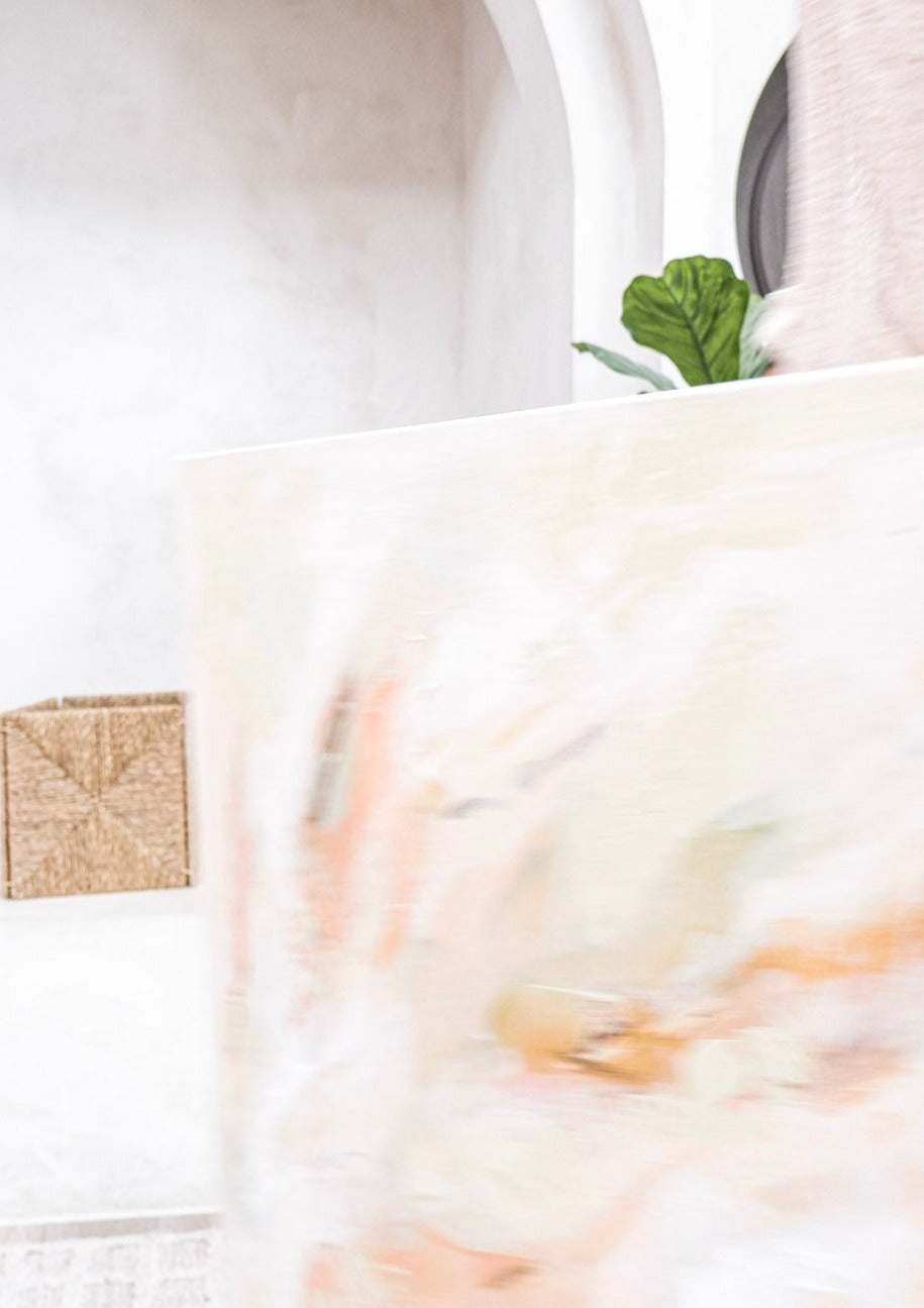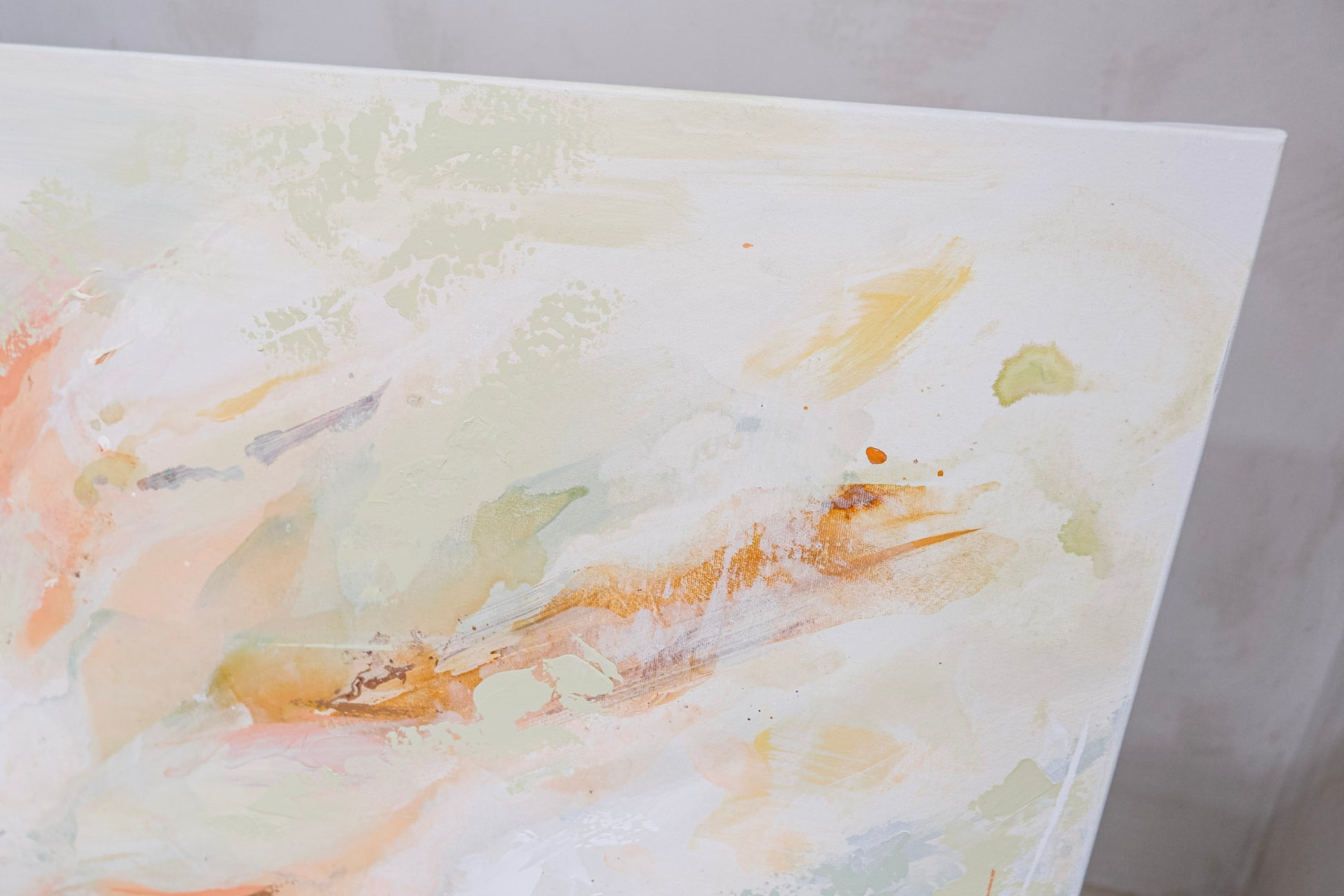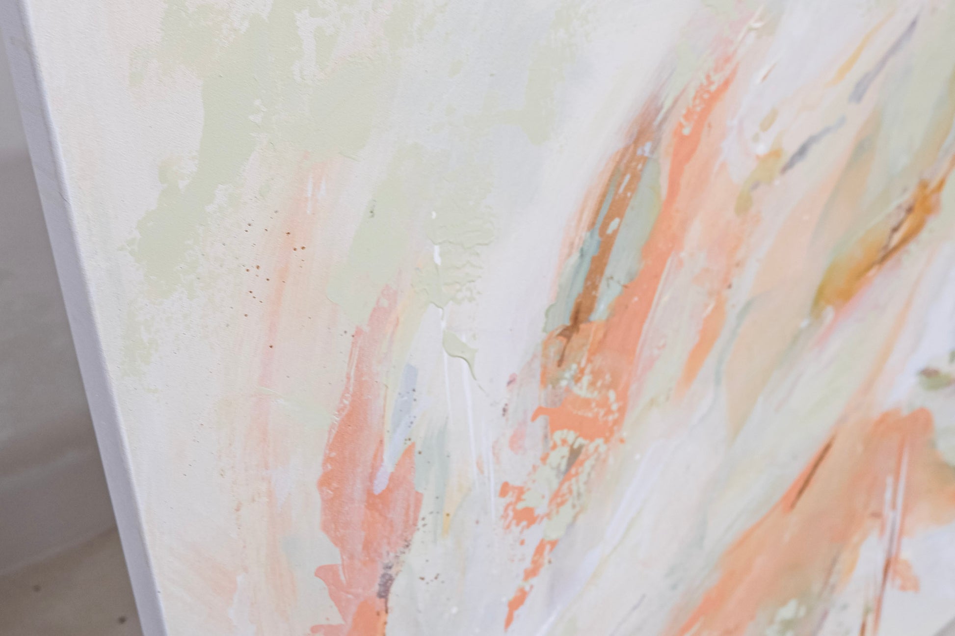 This piece invites introspection and serenity. Shades of sage green, dusty warm and peach tones balanced on a neutral palette creates movement that encourages quiet contemplation within the viewer's own reflections. The space will feel vibrant with the accent tones yet neutral and fresh.